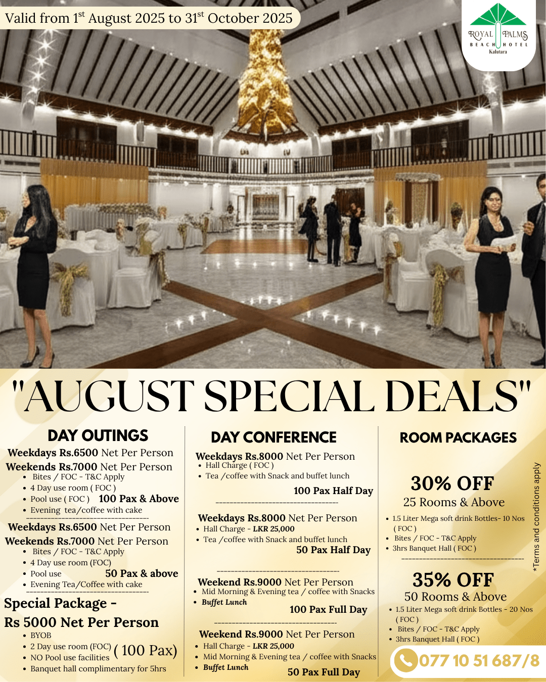 At Royal Palms Beach Hotel, we believe in offering exceptional value without compromising on luxury. Whether you’re planning a romantic getaway, a family vacation, or a peaceful solo retreat, our exclusive rates and seasonal offers are designed to enhance your stay while giving you the best possible experience.